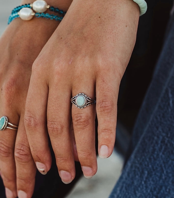 Material: 925 Sterling Silver & hand set Genuine Blue Larimar from the Dominican Republic. Due to the nature of genuine Larimar, the gem you receive may differ in natural color.
